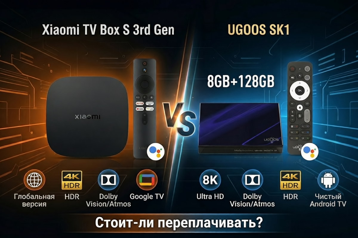 Привет, друзья! 🔥 Если вы ищете ТВ-приставку в 2026 году, чтобы смотреть 4K, Netflix, IPTV, Kodi или просто YouTube без тормозов — этот вопрос встаёт у многих. Xiaomi Mi TV Box S 3rd Gen — бюджетный хит, а UGOOS SK1 — мощный «монстр» с 8 ГБ RAM и 128 ГБ памяти. Стоит ли переплачивать 12 тысяч? Давайте разберёмся по полочкам, без маркетинговой чуши. Разница огромная. За эти деньги на Xiaomi можно купить ещё пульт с голосовым управлением или накопитель. Главное отличие между Xiaomi Mi TV Box S 3-го поколения и UGOOS SK1 кроется именно в начинке. Процессор у Xiaomi — Amlogic S905X5M (четыре ядра Cortex-A55 с частотой до 2,5 ГГц). У UGOOS стоит значительно более мощный чип Amlogic S928X-K: одно высокопроизводительное ядро Cortex-A76 + четыре Cortex-A55. Графический ускоритель — один из самых важных моментов. Xiaomi имеет Mali-G310 V2, а UGOOS SK1 оснащён Mali-G57 MC2, который в 2–3 раза мощнее. Благодаря этому UGOOS гораздо лучше справляется с тяжёлыми 4K-видео высокого битрейта, сложными