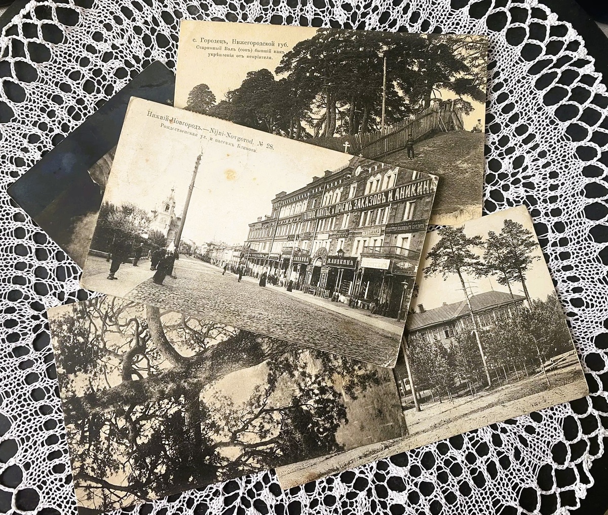 Первые две открытки с изображениями достопримечательностей Городца. На одной – Крестовая сосна на валу, почитаемая старообрядцами, а на другой – старинный Вал, некогда служивший городскими укреплениями.
