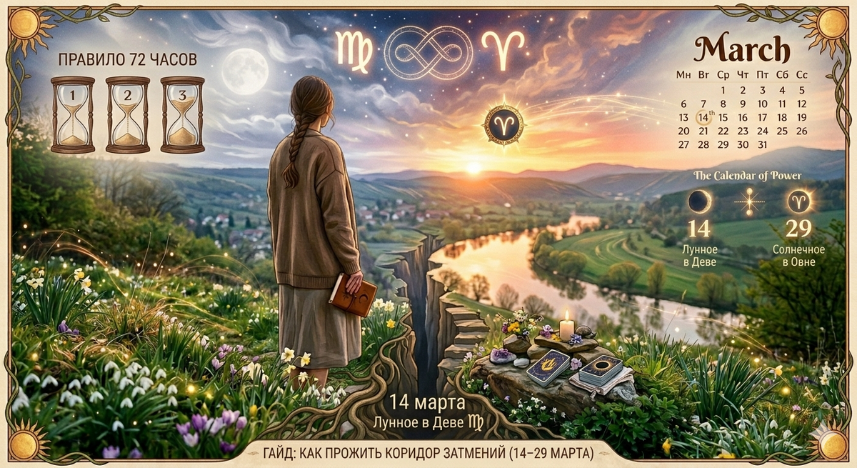 Этот период с 14 по 29 марта 2026 года — не просто «сложное время», а мощный энергетический портал. Мы идем от Лунного затмения в Деве к Солнечному в Овне. Это путь от наведения порядка в деталях до полной перезагрузки личности. Вот твоя инструкция, как пройти этот коридор с пользой и без потерь. Главное правило: «Закон 72 часов» В коридоре затмений эмоциональный фон нестабилен. Любое событие или ссора могут иметь фатальные последствия (эффект домино). Правило: Если возникло острое желание уволиться, расстаться или высказать всё, что думаешь — подожди 3 дня. Скорее всего, через 72 часа актуальность проблемы исчезнет, а дрова останутся целыми. Первая фаза: Очищение (14 – 21 марта) Затмение в Деве ♍ требует избавления от балласта. Что делать: Проведи генеральную уборку. Выбрось хлам, почисти память телефона, удали ненужные контакты. Здоровье: Дева отвечает за ЖКТ. Идеальное время для детокса, легкой диеты и чекапа организма. Работа: Завершай старые хвосты. Не начинай ничего