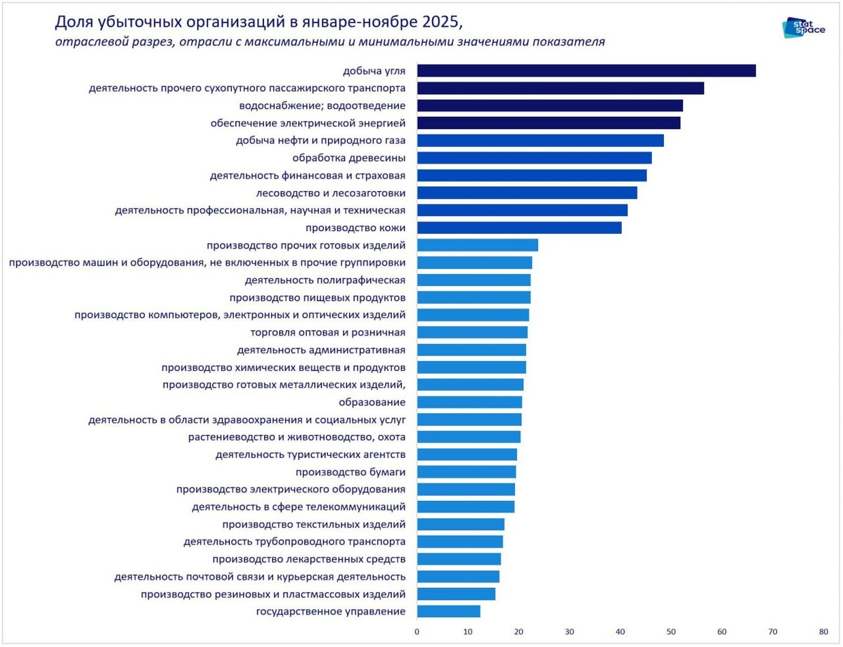 В среднем, 28,8% всех российских компаний оказались убыточными – это на 1,7 п.п. больше, чем годом ранее (было 27,1%). ▪️Больше всего убыточных компаний в добыче угля: 2/3 (ровно: 66,7%) от общего числа. ▪️Больше половины компаний также оказались убыточными в прочем сухопутном пассажирском транспорте (транспорт в целом себя тоже не очень чувствует) и "коммунальных" отраслях: электроэнергетике и водоснабжении. ▪️Добыча нефти и природного газа – на 5-м месте (~50%). Деятельность трубопроводного транспорта чувствует себя получше (~18%) ▪️Госуправление: "эффективность" зашкаливает @geonrgru | YouTube | sponsr.ru