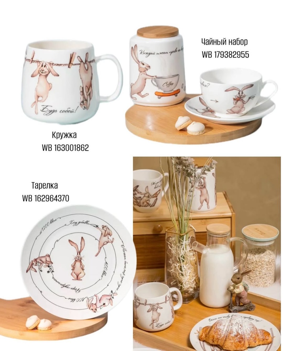 Это не просто посуда, а готовая атмосфера для утреннего стола. Набор выглядит цельно: предметы объединены сюжетом и мягкой цветовой гаммой, поэтому он легко «собирает» сервировку без лишних усилий. Особенно хороша идея с банкой: она делает чайный уголок аккуратным и законченно оформленным — как мини-композиция.