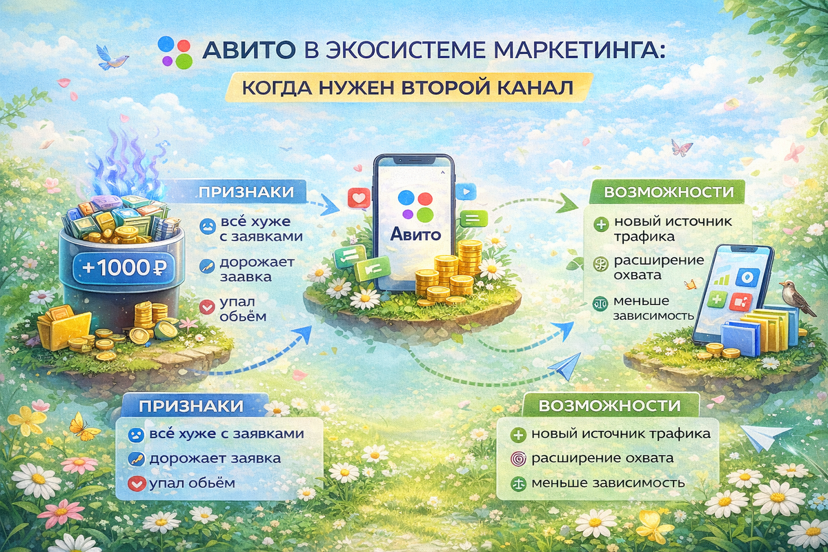 Авито может давать стабильный поток заявок. В некоторых нишах – до 60–80% всех обращений и в этот момент у бизнеса возникает ощущение: «Зачем нам ещё что-то? Всё и так работает». По опыту Andreev Digital, именно в этой точке и появляется стратегический риск. Потому что любой один канал – это зависимость. Разберём, когда Авито должно оставаться основным инструментом, а когда пора строить экосистему. Авито хорошо работает, если: Например: В таких нишах площадка может быть сильным фундаментом. Но даже здесь важно понимать: фундамент – это не всё здание. Если 70–80% заявок идут только из Авито, вы зависите от: Мы регулярно видим ситуации: И бизнес оказывается без подушки. Есть 4 сигнала, что пора расширяться. Диалогов больше не становится, даже при росте бюджета. Это значит, что вы достигли предела спроса в категории. Если экономика начинает сжиматься, нужно распределять нагрузку между каналами. Если цель – рост оборота, одного источника обычно недостаточно. Второй канал позволяет: В этом