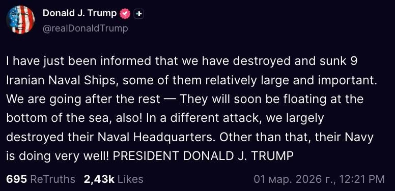 США потопили девять иранских кораблей и уничтожили штаб-квартиру ВМС ИРИ, утверждает Трамп