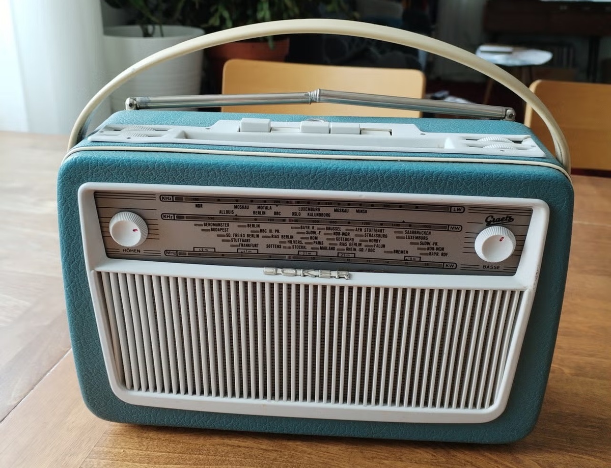 Прогуливаясь по просторам барахолки обнаружил весьма любопытный радиоприемник. Сначала даже ошибочно принял его за Schaub lorenz. А вот дату выпуска угадал точно - 1961 год. Всё дело в характерном дизайне, весьма модном в те года. Практически этот радиоприемник сверстник нашей Спидолы, только еще и с диапазоном УКВ. У нас тогда еще и ГОСТа то не было на переносные УКВ приемники. Интересна была история появления этой модели радиоприемников. В 1955 году на радиовыставке в Дюсельдорфе был показан полностью транзисторный приемник. Радиоприемник был сделан в единственном экземпляре, но ему крупно повезло: после выставки он сразу попал к коллекционеру. Только благодаря этому в сеть попали фотографии устройства этого чуда. Для наглядности корпус сделали из оргстекла. Обратите внимание: дизайн корпуса взят от лампового стационарного радиоприемника, Komtess 214W . Ферритовая антенна мощнейшая Строгая, но симпатичная панель управления Вся конструкция скомпонована на манер ламповых радиоприемн