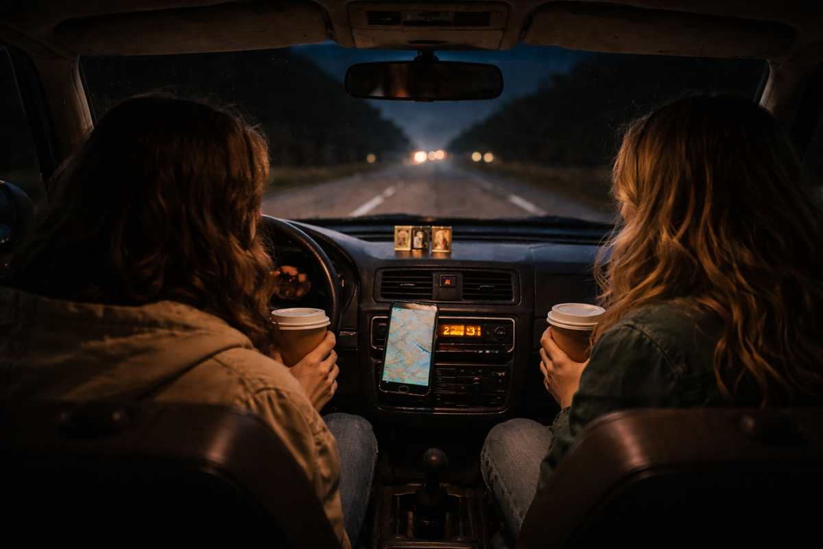 В пятницу мы выехали в четыре часа. На Софийской сразу встали в пробку. Простояли почти час. Потом заехали на заправку за городом, взяли кофе, Алиса курила на улице, и мы задержались ещё на полчаса. Когда выехали на трассу, уже темнело. Сентябрь, темнеет рано.