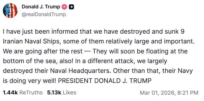 Мы преследуем остальные — они тоже скоро будут плавать на дне морском! В ходе другой атаки мы в значительной степени разрушили их штаб-квартиру ВМС. А в остальном их флот в полном порядке! 👆Дональд (Отважный Янки) Трамп. 🟪Читай в Max | 🚀Читай в Telegram | 🥰Смотри на RUTUBE