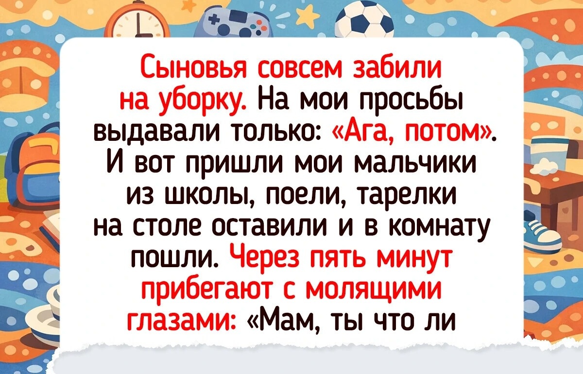 Сыновья совсем забили на уборку. На мои просьбы выдавали только: «Ага, потом». И вот пришли мои мальчики из школы, поели, тарелки на столе оставили и в комнату пошли. Через пять минут прибегают с молящими глазами: «Мам, ты что ли пароль от wi-fi сменила? Ну скажи новый, мам!» Я молча протягиваю им бумажку, где написано: «На дне горы посуды будет вам пароль. Достойно пройдите этот путь!» Никогда еще кухня не была убрана так быстро. Отмыли все, включая плиту, за 30 минут.