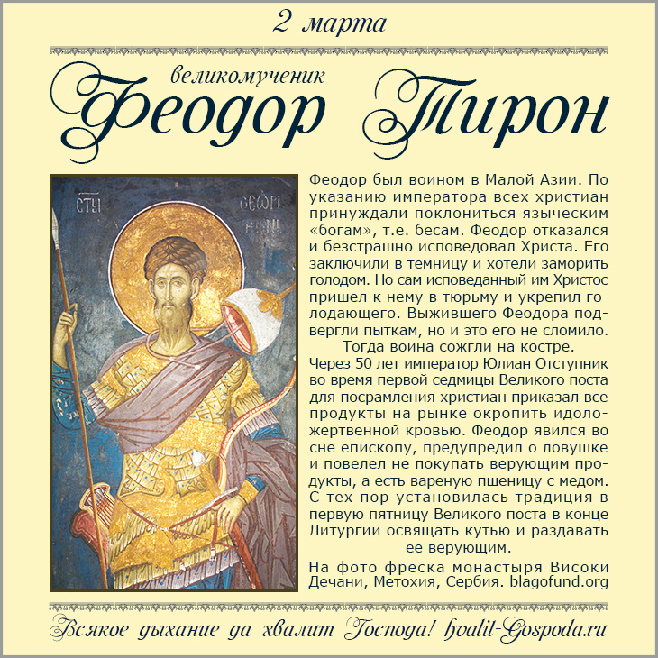 Феодор был воином в Малой Азии. По указанию императора всех христиан принуждали поклониться языческим «богам», т.е. бесам. Феодор отказался и безстрашно исповедовал Христа. Его заключили в темницу и хотели заморить голодом. Но сам исповеданный им Христос пришел к нему в тюрьму и укрепил голодающего. Выжившего Феодора подвергли пыткам, но и это его не сломило. Тогда воина сожгли на костре. Через 50 лет император Юлиан Отступник во время первой седмицы Великого поста для посрамления христиан приказал все продукты на рынке окропить идоложертвенной кровью. Феодор явился во сне епископу, предупредил о ловушке и повелел не покупать верующим продукты, а есть вареную пшеницу с медом. С тех пор установилась традиция в первую пятницу Великого поста в конце Литургии освящать кутью и раздавать ее верующим. На фото фреска монастыря Високи Дечани, Метохия, Сербия. Blagofund.org Тропарь великомученику Феодору Тирону, глас 2 Велия веры исправления,/ во источнице пламене, яко на воде упокоения,/ святый
