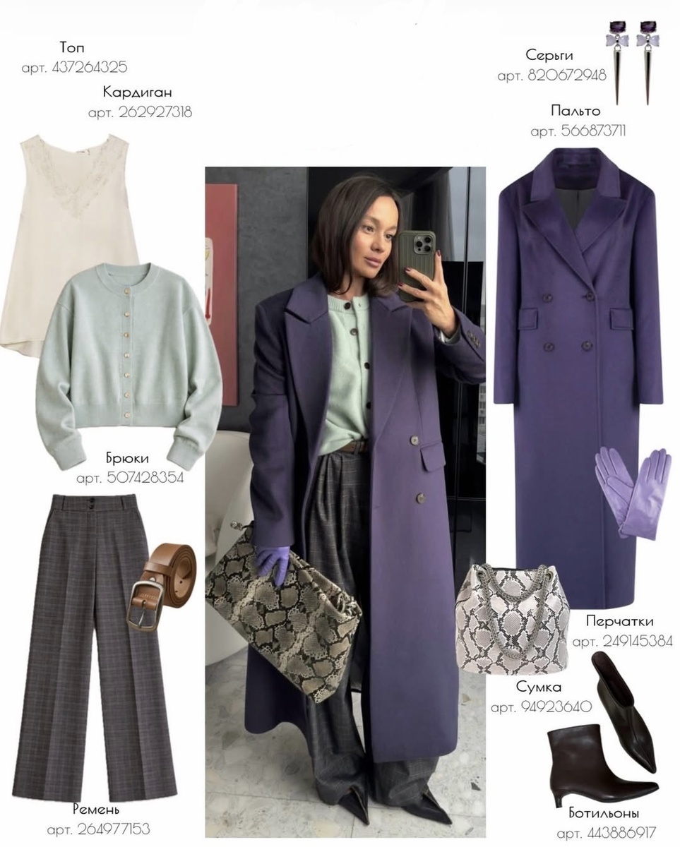 Этот комплект построен на грамотной формуле: яркое пальто как главный акцент + спокойная база + сложные фактуры + одна характерная деталь. Мятный кардиган смягчает фиолетовый, клетка добавляет структуры, ремень даёт тёплый баланс, а сумка и ботильоны делают образ современным и собранным. В итоге получается стильный городской шик — для встреч, работы, прогулок и ситуаций, когда хочется выглядеть заметно, но без лишней громкости.