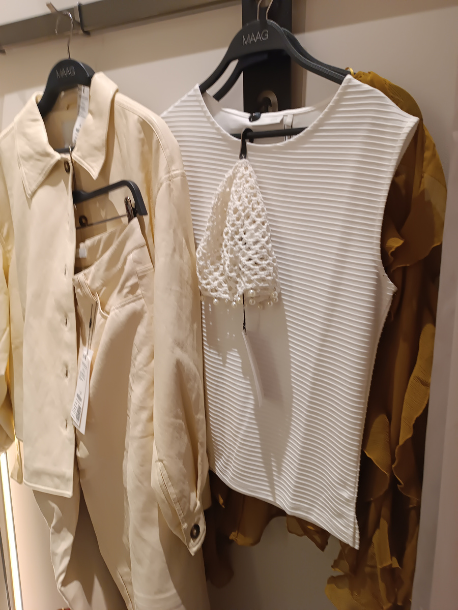 Здравствуйте, мои хорошие и преданные! Меня зовут Анна, и я живу в Ростове-на-Дону. и да, я иногда хожу в обычные магазины, что бывает очень редко. В это раз встретились с подругой в ТЦ. Просто пришли и понеслось- у нее запрос на что-то новое. Вот это я обожаю, это для меня наслаждение( ведь себе уже мало что хочется, в свете закрытия потребностей качественной одежды из секонд-хендов). В данном обзоре буду только я, что нашла для себя, без покупок. А вот подругу я не стану показывать, не этично это, без разрешения особенно- но она мне сказала, что почувствовала себя как в Модном приговоре- со стилистом и примеряла то, что сама бы в жизни не подумала. Ладно, покажу то, что мне понравилось, только для контента- составы полный ПЭ. Просто жуть! Начнем с МААГ, многими любимый. Брючный костюм из эко-кожи, очень мягкий и приятный тактильно. Цвет сливочного масла. Но в штанах я запарилась))ничего не дышит там...зато красивоооо! Блузка- майка только для примерки взята. Блузка в тиле бохо. Шик