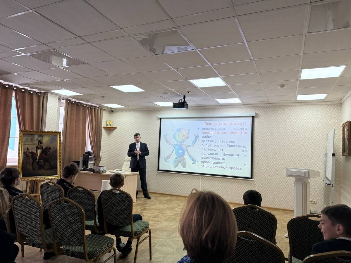 На переменах в течение недели ученики соревновались в сообразительности и быстроте реакции, отвечая на вопросы занимательной викторины, а также знакомились с интересными фактами из истории развития роботов. В четверг состоялся факультетский час, на котором команды Альфы, Беты, Гаммы и Дельты разрабатывали собственные модели социально полезного робота: продумывали его специализацию, прорабатывали функции и детали внешнего вида, а затем представляли и защищали свой проект перед товарищами. Копилки всех факультетов за истекшую неделю пополнились новыми баллами, и в ходе напряженных интеллектуальных соревнований команда Альфы уверенно вышла на первое место, явно претендуя на победу в текущей четверти. Такие события позволяют гимназистам расширять кругозор и учат работать в команде. Впереди новая неделя, посвященная химии.