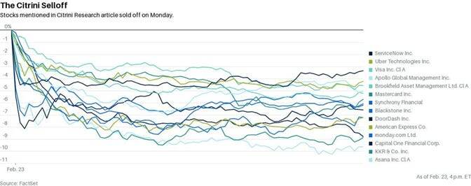 На прошлой неделе компания Citrini Research выпустила пост на Substack под названием «Глобальный кризис интеллекта 2028» (THE 2028 GLOBAL INTELLIGENCE CRISIS). Это был не новостной репортаж, а гипотетический сценарий, в котором ИИ провоцирует масштабное сокращение расходов и глобальную рецессию. Затем американский рынок немного свихнулся: акции компаний, связанных с ИИ и технологическим сектором в целом, пошли вниз. На графике ниже показана лишь часть нанесённого ущерба.