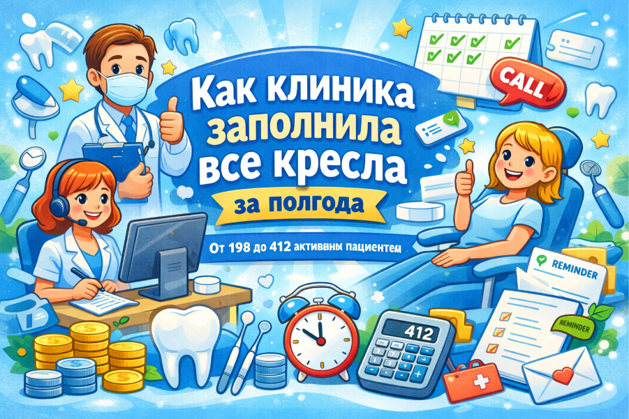 Клиника в Екатеринбурге работала несколько лет и считала себя стабильной. Пока не посчитала реальные цифры. Из 900 пациентов активных оказалось только 198. Разбираем что сделали за полгода и как активная база выросла до полной загрузки врачей.