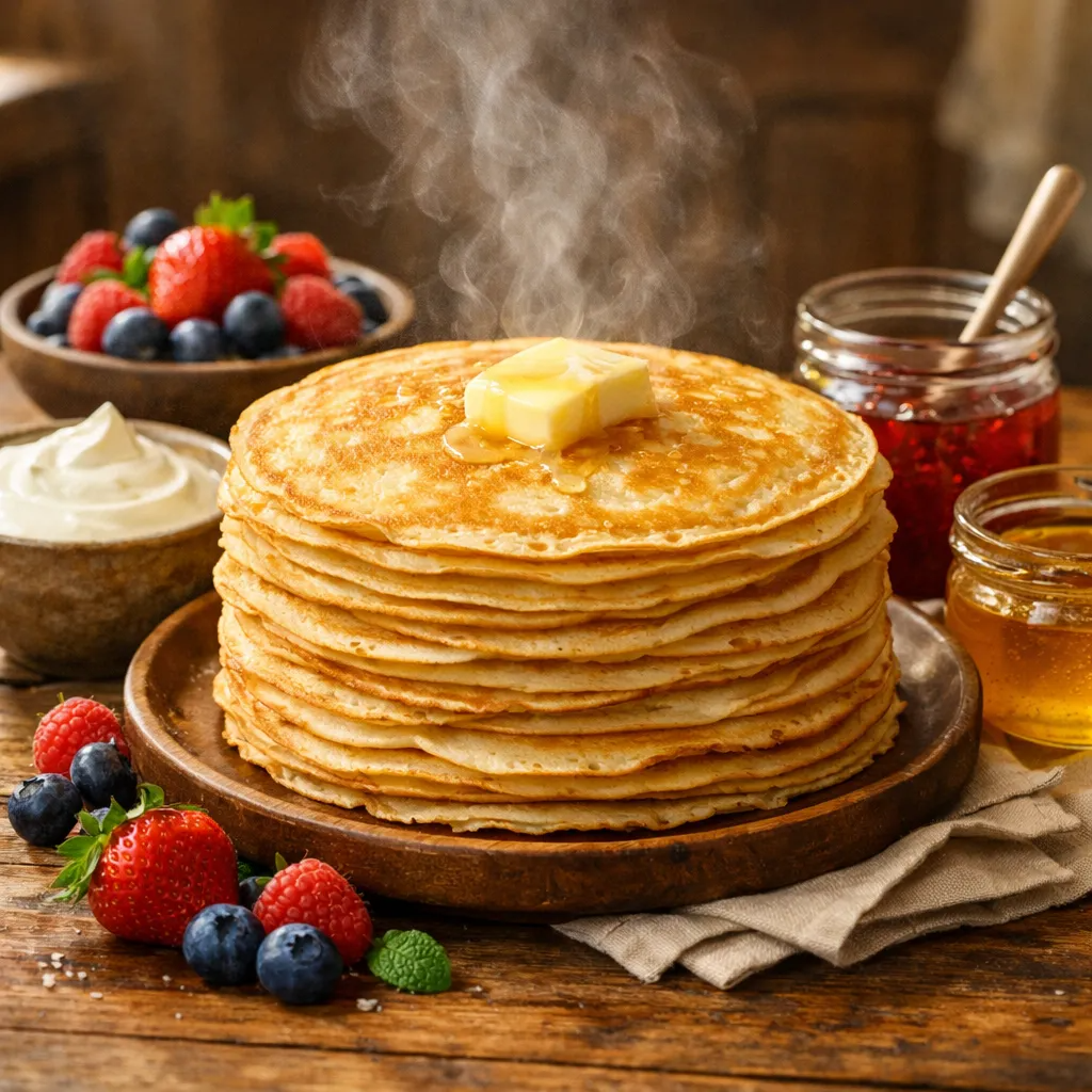 Ингредиенты (на 15–20 блинов, диаметр 20–22 см): Подавайте горячими с: Калорийность одного блина (без начинки) ~120–150 ккал. Приятного аппетита! 🥞