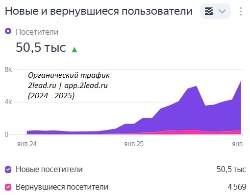 Цифровые сервисы app.2lead.ru (калькуляторы инфляции, валют, аналитика, прогнозы) разработаны в конце 2024 года с помощью ИИ-ассистентов. С весны 2025 года новые сервисы не размещали. В течение года ежемесячно обновляли данные по уровню инфляции и инфляционным ожиданиям, а также составляли короткие обзоры инфляции на основе данных ЦБ РФ и Росстата. Кратный рост органического трафика произошел в начале года, затем трафик держался на уровне около 100 вернувшихся пользователей еженедельно. ИКС (индекс качества сайта) с момента запуска сервисов последовательно рос - по данным Яндекса. По запросу «Калькулятор инфляции» сайт входил в топ-10/топ-20 поисковой органической выдачи Яндекса. С высокой степенью вероятности можно предполагать, что динамика трафика будет стабильной и далее, а запуск новых сервисов привлечет новых пользователей.