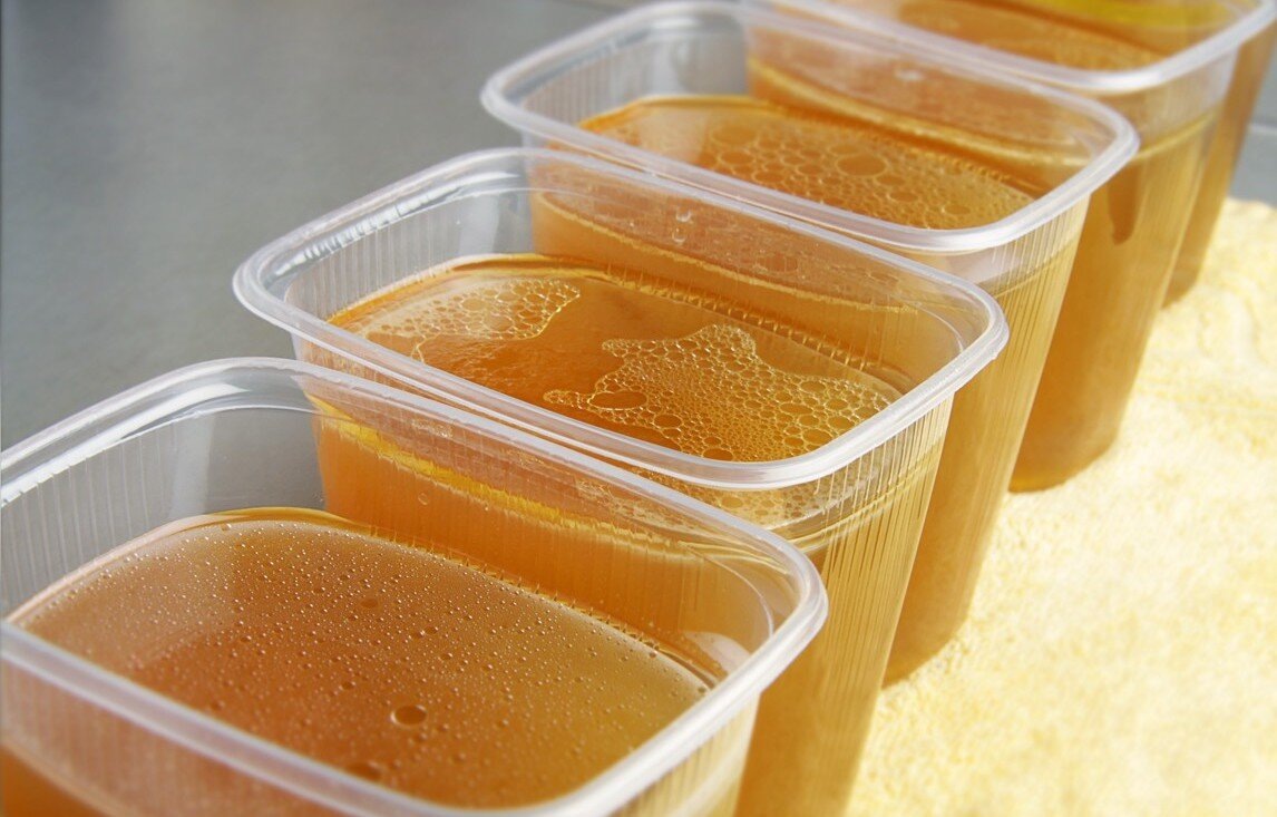 Бульон - золотая заготовка. Достали, разморозили, и суп можно собрать за считанные минуты. В этом нет ничего сложного, но есть нюансы. Сначала бульон нужно “довести до чистоты”. Достаете из него кости или мясо. Овощи и травяной пучок можно смело выбрасывать, они всё уже отдали. Сам бульон обязательно процеживаем через мелкое ситечко. Тогда уйдут мелкие кусочки овощей и крошки пены, и бульон получится прозрачный, красивого золотистого оттенка. Переливаем в контейнер или банку в которой будете замораживать. Оставляйте сверху 1–2 см свободного места. Жидкость при заморозке увеличивается в объёме, и если налить “под крышку”, потом крышку выгнет, а стекло может и треснуть. Поставьте в холодильник хотя бы на пару часов, чтобы хорошо охладился. Потом закрыли крышкой, подписали: что это, объём и дата. И в морозилку при -18. Хранится замороженный мясной бульон до 4 месяцев при -18. Теперь про разморозку. Тут многие делают ошибку, от которой потом он становиться мутным. Самый правильный вариант