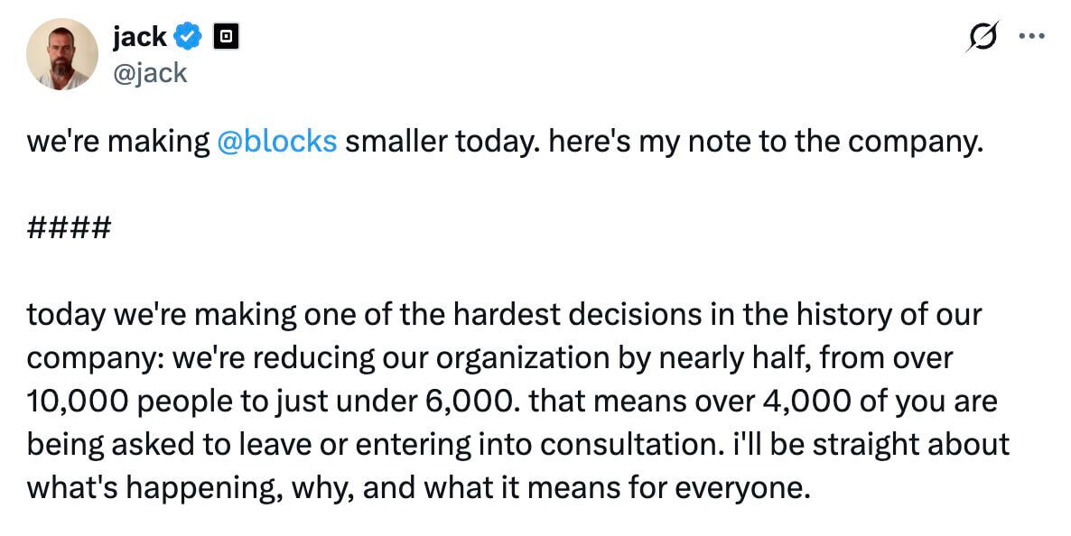Джек Дорси (создатель Twitter) сегодня уволил 4000 человек из своей новой компании Block. Причина? ИИ.
