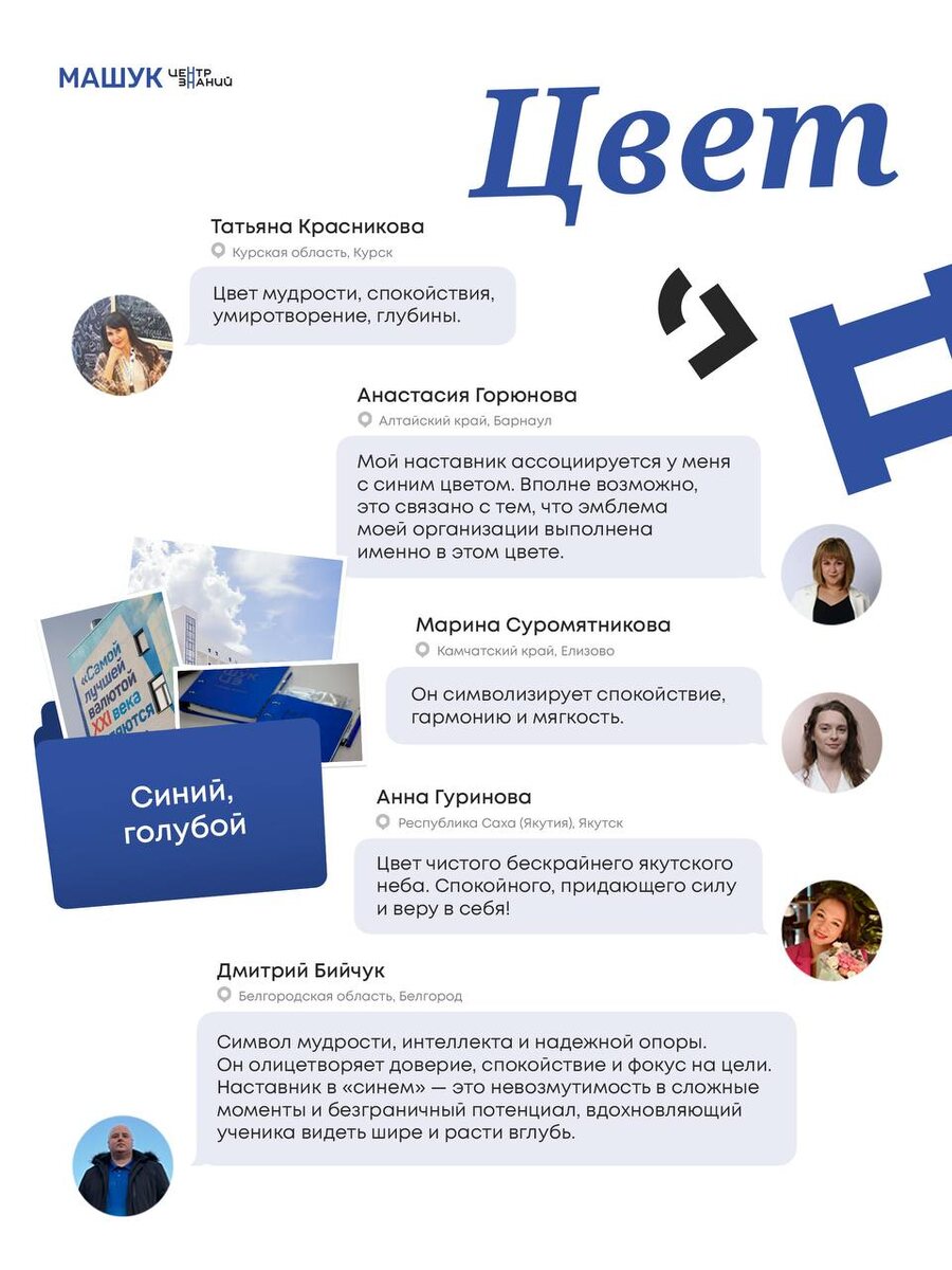 ? Цвет спокойствия, мудрости, рассудительности, развития, поддерживающего взгляда и доброго слова. 👩🏫 Участники Зимнего ПедСовета в карточках рассказали о своих ассоциациях, каждая из которых добавила новый оттенок в эту важную палитру. Один из них оказался синим – фирменным цветом Центра знаний «Машук». И это не совпадение 😌 ✏️ А с каким цветом вы ассоциируете своего наставника? Пусть ваши истории в комментариях станут частью большого и доброго праздника!