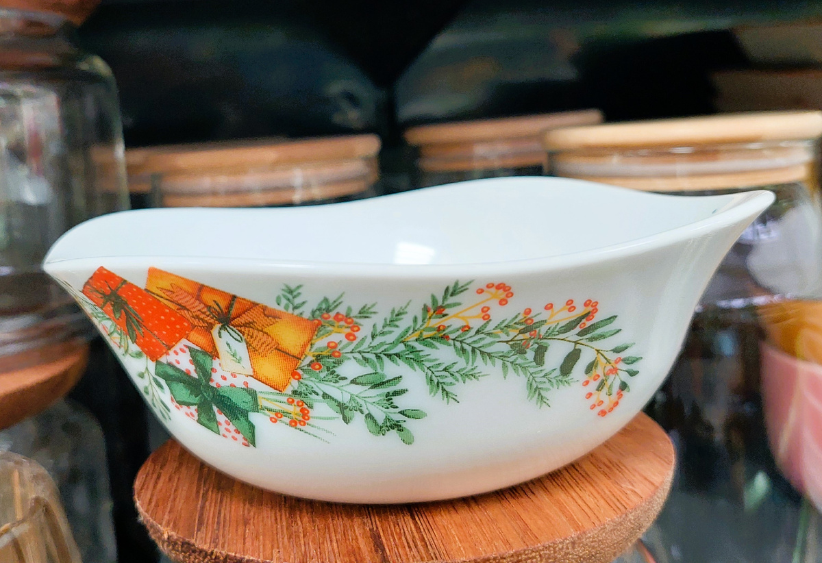 Посмотрите, какой симпатичный принт на этом салатнике: веточка мимозы и рядом подарки, перевязанные ленточками. Салатник от "Xmas Gift", его приятно взять в руки, у него красиво изогнуты края волнами. Прекрасно подойдёт для подачи салатов, закусок и десертов и создаст атмосферу уюта и торжества за столом. Объём: 550 мл. Диаметр: 15 см. Состав: опаловое стекло. Производство Иран. Цена 133 рубля.