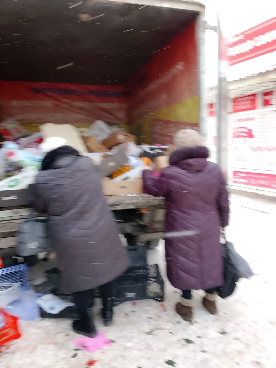 Пенсия в России. На рынке стоит машина и туда приносят непроданные или плохие уже овощи и фрукты. И пенсионеры караулят и набирают себе. Два деда сегодня подрались за ящик подпорченных мандарин. На фото две бабушки себе набирают фрукты. Мне всегда грустно смотреть на эту машину. Не дай Бог такой старости, но радует, что пенсионеры могут что-то набрать себе. Понятно, что там не первый и не третий сорт, а то, что не товарного вида. Надеюсь, что меня жизнь не поставит раком и я никогда не буду так ковыряться в этой машине🙈