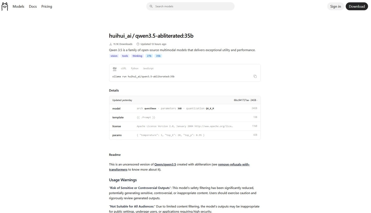 Расцензуренная версия Qwen3.5-35B-A3B, команда huihui-ai🎹 сделала с применением техники abliteration (удаления механизма отказов без полного переобучения модели) вот тут подробнее описывал что это такое 35B параметров, 3B активных при инференсе, контекстное окно на 262144 токенов(нативно), расширяется до 1010000 токенов, 256 экспертов (8 активных + 1 общий) Qwen3.5-35B-A3B при активных 3B параметрах обошола предыдущее поколение Qwen3-235B-A22B (22B активных параметров) Ее можно очень легко через Ollama запустить, если поиграться хотите, советую этот способ: Вот тут скачиваем ollama, потом идем в cmd и пишем это ollama run huihui_ai/qwen3.5-abliterated:35b Все потом опять в ollama заходим и там уже появится наша модель HuggingFace (без цензуры) Оригинал HF Документация по Abliteration