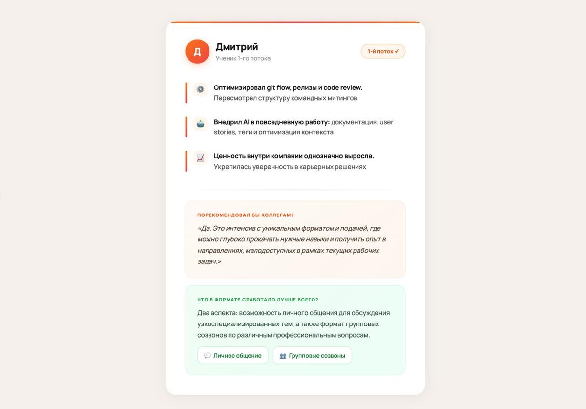 " - Написал один из моих подписчиков. Есть момент в карьере разработчика, когда работа становится похожа на "день сурка". - Задачи, ревью, деплой. И в какой-то момент ты осознаёшь - прошло 2-3 года, а уровень тот же. Почему так происходит - Зачастую из-за отсутствия навыка продвигать свои решения и идеи. Грамотно соотносить риски своих предложений и уметь их подсветить так, чтобы это выглядело выгодно для бизнеса. Один из мои учеников - Дима Пришел на обучение как крепкий мидл разработчик. - Но столкнулся с проблемой карьерного роста. Ему не хватало опыта работы в большой команде. ИИ использовал интуитивно, без системы, и ему не хватало взгляда шире своего проекта. 📈 За время обучения - Дима начал влиять на то, как работает команда вокруг него - от процессов до инструментов. Появилось чёткое понимание, куда двигаться дальше. Большинство работают в режиме: «Мне дали задачу - я сделал» И это не лень. Просто никто не объяснил, что смотреть шире - это тоже часть работы. Что с этим