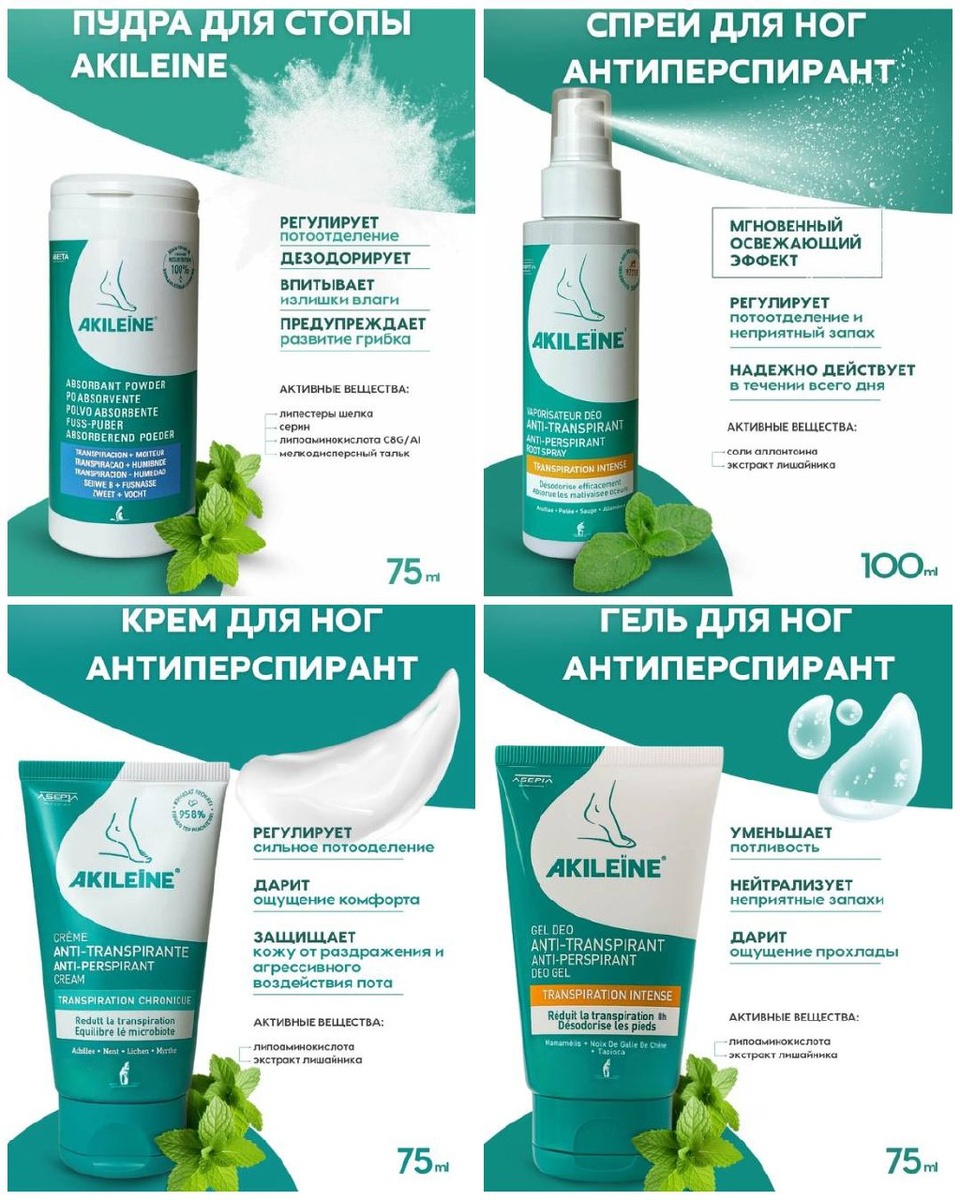 Гипергидроз стоп требует не просто маскировки симптомов, а создание неблагоприятной среды для патогенной микрофлоры. Важную роль играет домашний уход. Грамотно подобранные профессиональные средства позволяют эффективно регулировать потоотделение и устранять дискомфорт, а также помогают предотвратить сопутствующие проблемы (неприятный запах, грибковые поражения). На фото — проверенные решения, которые я рекомендую своим клиентам. Akileine (Монако) 1. Пудра для стоп 2. Спрей для ног Антиперспирант 3. Крем для ног Антиперспирант 4. Гель для ног Антиперспирант Footura (Россия) 1. Крем для ног Антиперспирант 2. Нормализуюший антиперспирант для ног 3. Спрей для ног Антиперспирант Наутилус (Россия) 1. Лосьон спрей Антигрибок для гигиенической обработки стопы и обуви Podiafarm (Россия) 1. Крем с тальком 100 мл / 250 мл 2. Микротальк 25 гр / 50 гр Готова подробно рассказать о каждом средстве, помочь с выбором исходя из ваших особенностей иуточнить актуальную стоимость. Для этого напишит