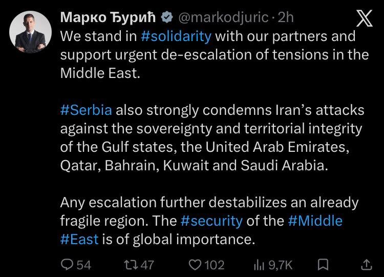 : «Сербия также решительно осуждает иранские нападения на суверенитет и территориальную целостность государств Персидского залива, Объединенных Арабских Эмиратов, Катара, Бахрейна, Кувейта и Саудовской Аравии». 🇦🇪🇶🇦🇧🇭🇰🇼🇸🇦 Все эти страны признали «Косово» 🇮🇷 Иран НЕ признал «Косово» Война на Ближнем Востоке - не наша война! Почему нельзя просто промолчать, руководствуясь национальными интересами, и не портить репутацию Сербии?! Вот в чем проблема просто промолчать, как молчит МИД при регулярном терроре сербов в Косово и Метохии?! Напомню, что после назначения нынешнего министра Джурича на пост главы МИД, за один год 4 страны (!) признали «Косово»: Багамские острова, Кения, Судан и Сирия. И МИД молчал! А тут решил подлить масла в огонь. Видимо, это важнее, чем Косово и Метохия, судя по заявлениям. #Сербия #Иран @vestniksrb — главное о Сербии и Балканах