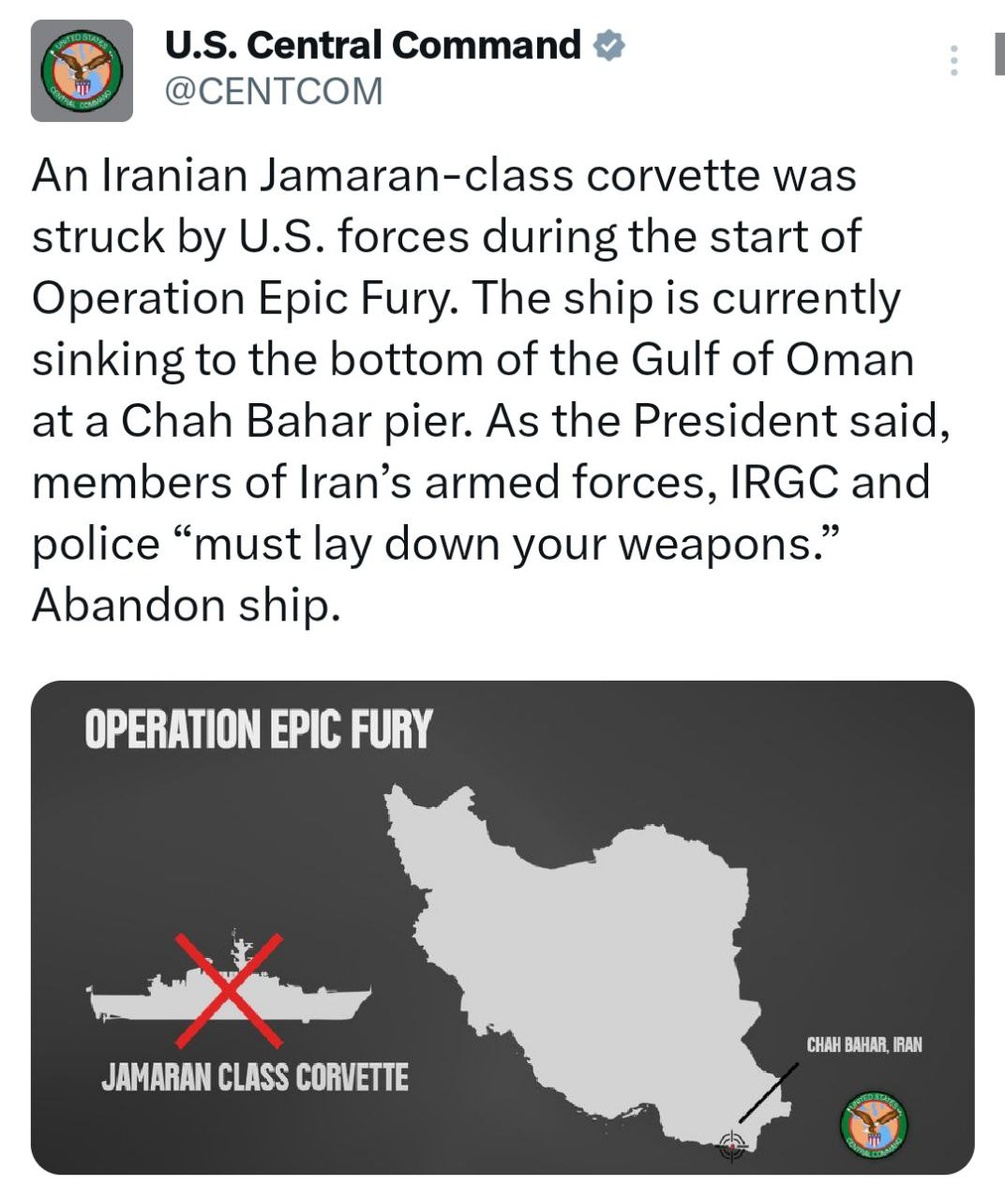 CENTCOM: Iranian corvette 'STRUCK by US forces, currently SINKING to bottom' of sea