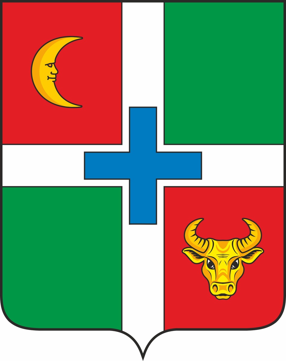 «В червленом и зеленом разбитом начетверо поле поверх деления – серебряный узкий крест, обремененный отвлеченным равноконечным лазоревым крестом и сопровождаемый в червлени вверху золотым полумесяцем рогами влево, а внизу золотой бычьей головой настороже».
