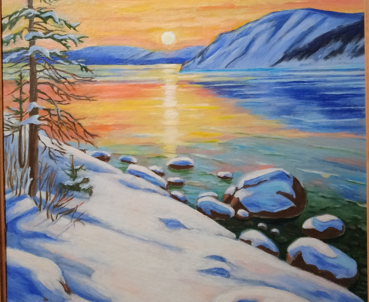Солнечные лучи скользят по прозрачной поверхности воды, рисуя золотую дорожку от горизонта до покрытого снегом берега.