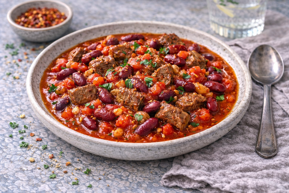 Сочная постная говядина, мягкая красная фасоль и густой натуральный томатный соус с чесноком и специями. Если хочется острее - добавь чили в конце. Минимум масла, максимум вкуса и пользы ✨ • Постная говядина (вырезка или филе) - 170 г 🥩 • Фасоль красная готовая (отварная или консервированная) - 160 г 🫘 • Томаты рубленые (пассата или свежие измельчённые) - 200 г 🍅 • Лук - 70 г 🧅 • Чеснок - 5 г (1-2 зубчика) 🧄 • Оливковое масло - 5 мл 🫒 • Соль, свежемолотый чёрный перец - по вкусу • Паприка сладкая (или копчёная) - ½-1 ч. л. • По желанию: щепотка чили или свежий перец для остроты - Хочешь ещё легче - обжаривай мясо без масла на антипригарной сковороде. - Для большей сытости - подай с 50 г цельнозернового хлеба или булгура. - Если любишь острее - добавь в конце свежий чили или хлопья чили по вкусу. ~25 минут (из них активных - около 10 минут) ≈ 540 ккал Белки - 42 г Жиры - 18 г Углеводы - 52 г - Высокий белок от говядины + клетчатка от фасоли и томатов = сытость на 4–5 часов без тяж