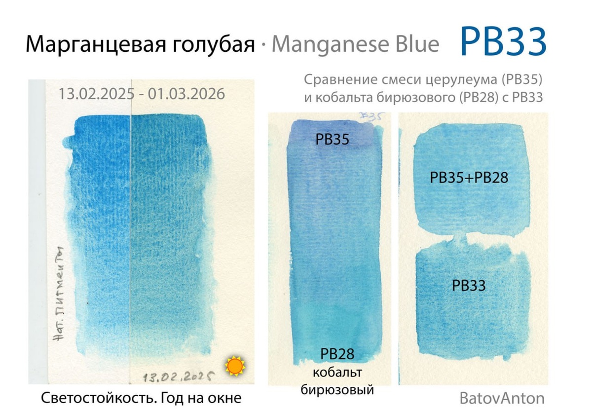 Марганцевая голубая (PB33) — неорганический пигмент с очень неплохой общей прочностью и хорошей насыщенностью, которая к сожалению немного