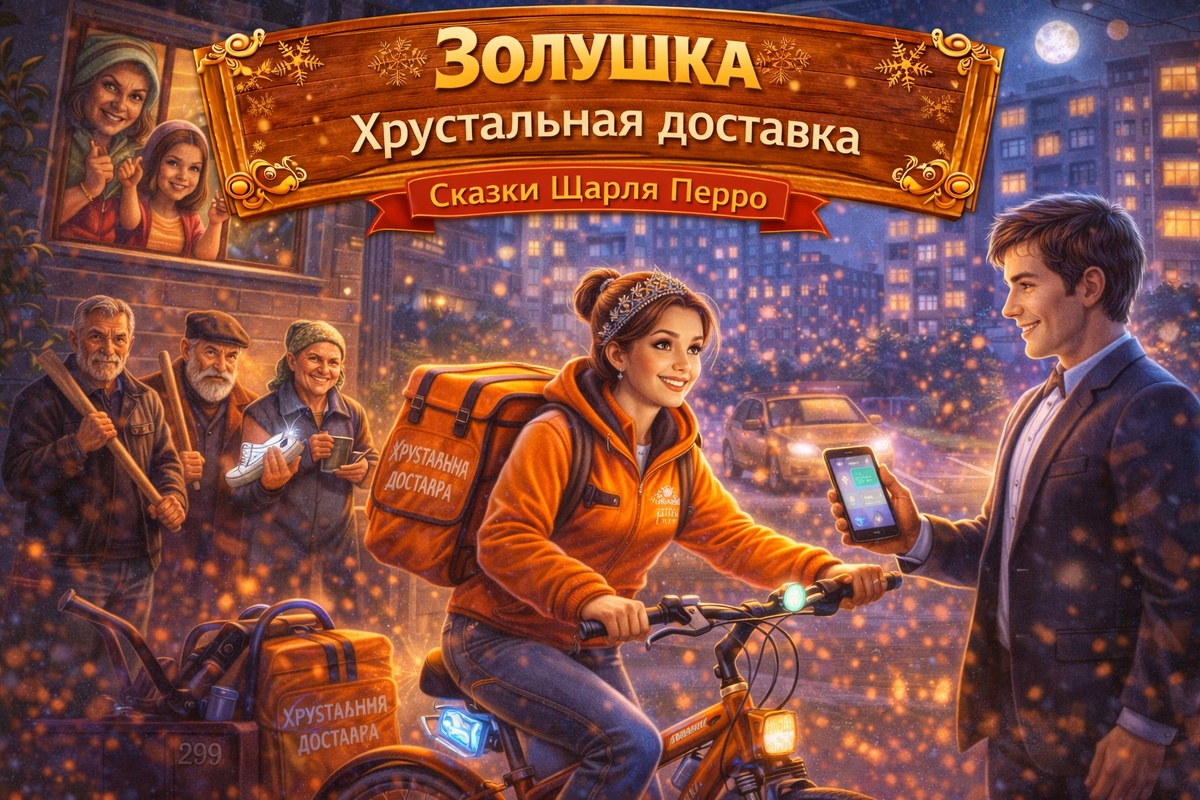 Золушка работала курьером в службе доставки еды «Хрустальная доставка». Каждое утро она надевала ярко-оранжевую куртку, садилась на старенький велосипед «Урал» (который помнил еще Ленина) и развозила борщи, плов и роллы по всему району. Велосипед скрипел, тормоза не работали, а вместо звонка у него была погремушка от детской игрушки, привязанная изолентой.