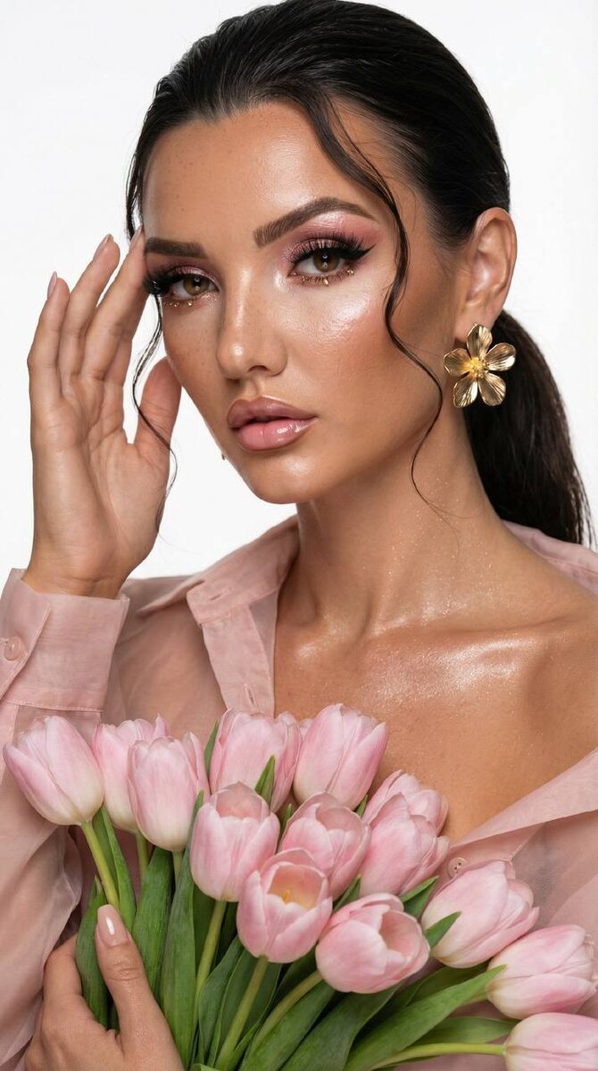 😁 А пока вам промптик Ultra-realistic glamorous beauty portrait of a stunning woman holding a large bouquet of soft pink tulips, modern spring fashion aesthetic, luxurious Instagram beauty style. Medium close portrait (chest-up), camera positioned slightly above eye level, subtle high-angle perspective. Direct confident eye contact. Makeup (high-detail beauty focus): wet-shimmer pink and rose-gold eyeshadow, long sharp black fox eyeliner, extremely long fluffy lashes, inner corners highlighted, small golden glitter accents along the lower lash line. Skin perfectly smooth with warm bronzed tone and strong dewy glossy glow. Lips overlined in soft brown contour, center filled with pink gloss, mirror finish. Hair: sleek “wet look” hair pulled back into a long low ponytail, a few styled face-framing curls on the forehead. Styling: sheer blush pink organza or silk shirt worn slightly off-shoulder, large gold flower earring, subtle body shimmer on collarbones and shoulders. Interaction: