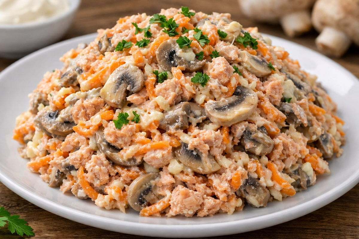 Новый год мы всегда отмечали в большой компании с родственниками и с детьми. Но дети вырастают, им становится с нами скучно. И наступил момент, когда дочка с подругами решила встречать праздник у нас дома, а мы с мужем, проявив родительскую мудрость, деликатно удалились, оставив молодёжи полную свободу и дом в полное распоряжение. «Всё будет красиво, мам!» — пообещала дочка, и мы поверили. Вечером первого января мы вернулись домой. Дом встретил нас ароматом хвои и уставшими, но счастливыми лицами девчонок. А холодильник... холодильник был настоящей сокровищницей! Подруги устроили настоящий кулинарный фестиваль: каждая принесла своё фирменное блюдо. Там были и салаты, и закуски, и даже какой-то загадочный торт. Но один салат привлёк наше внимание сразу. С виду скромный, но какой-то очень аппетитный. Дочка сказала, что это творение Лены, её подруги. Мы попробовали — и пропали. Нежная горбуша, ароматные грибы, сочная морковка... Всё в идеальном балансе. Спросили рецепт, и Лена с удоволь