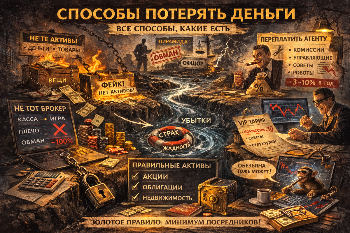 Мы уже разобрали два способа потерять деньги: неправильные активы и фейковые записи. Третий способ — переплатить агенту. Любой агент на финансовом рынке — это лишние расходы. Если без него можно обойтись — обходитесь.