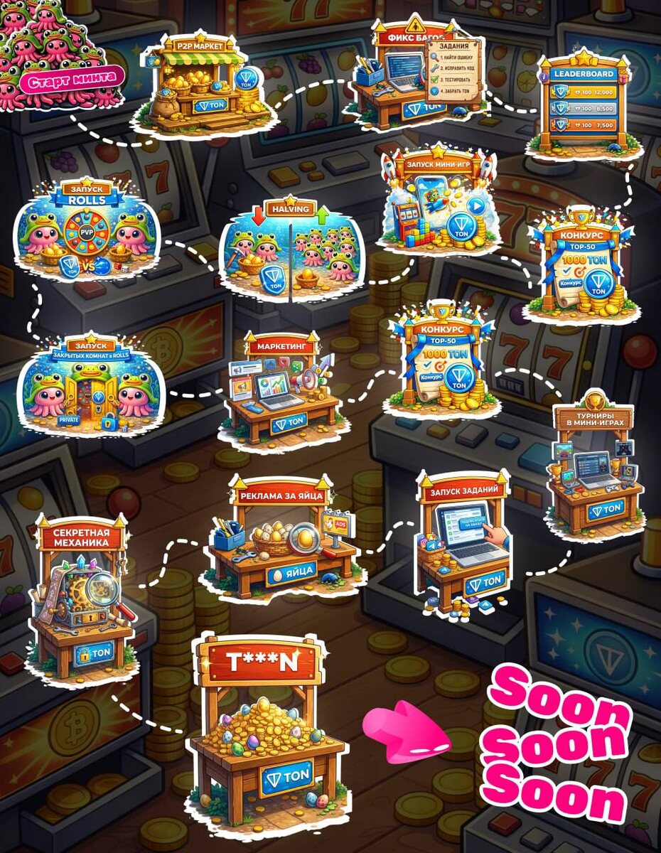 🦑 СЕГОДНЯ НАМ МЕСЯЦ, ПЭПЭ! 🦑 Перед запуском приватных комнат и закрытых роллсов - показываем наш путь и куда ныряем дальше! Уже сделано: ✅ Старт минта ✅ Запуск игры + P2P-маркет ✅ Фикс багов (океан чище некуда) ✅ Лидерборд ✅ Первый конкурс TOP-50 ✅ Запуск мини-игр ✅ Халвинг ✅ Запуск BETA-версии Rolls Скоро: 🔥 Закрытые комнаты в Rolls 🔥 Второй этап маркетинга 🔥 Второй конкурс TOP-50 🔥 Турниры в мини-играх 🔥 Задания и награды 🔥 Реклама за яйца 🔥 Секретная механика (пока молчим 👀) 🔥 T***N ......soooon...... SquidPepe становится гемблинг-платформой с интеграцией Telegram-подарков! ➡️ Наше ключевое направление на ближайший цикл - развитие платформы как геймифицированное мини-казино. Мы создадим серию азартных мини-игр внутри SquidPepe, где основные внутриигровые шнейне яйца станут ставками. Что это значит: Новая аудитория: Весь маркетинг будет таргетирован на крипто-гемблинг сегмент - пользователей, привыкших к риску и ищущих адреналин. Новая экономика: Мы создадим спрос на