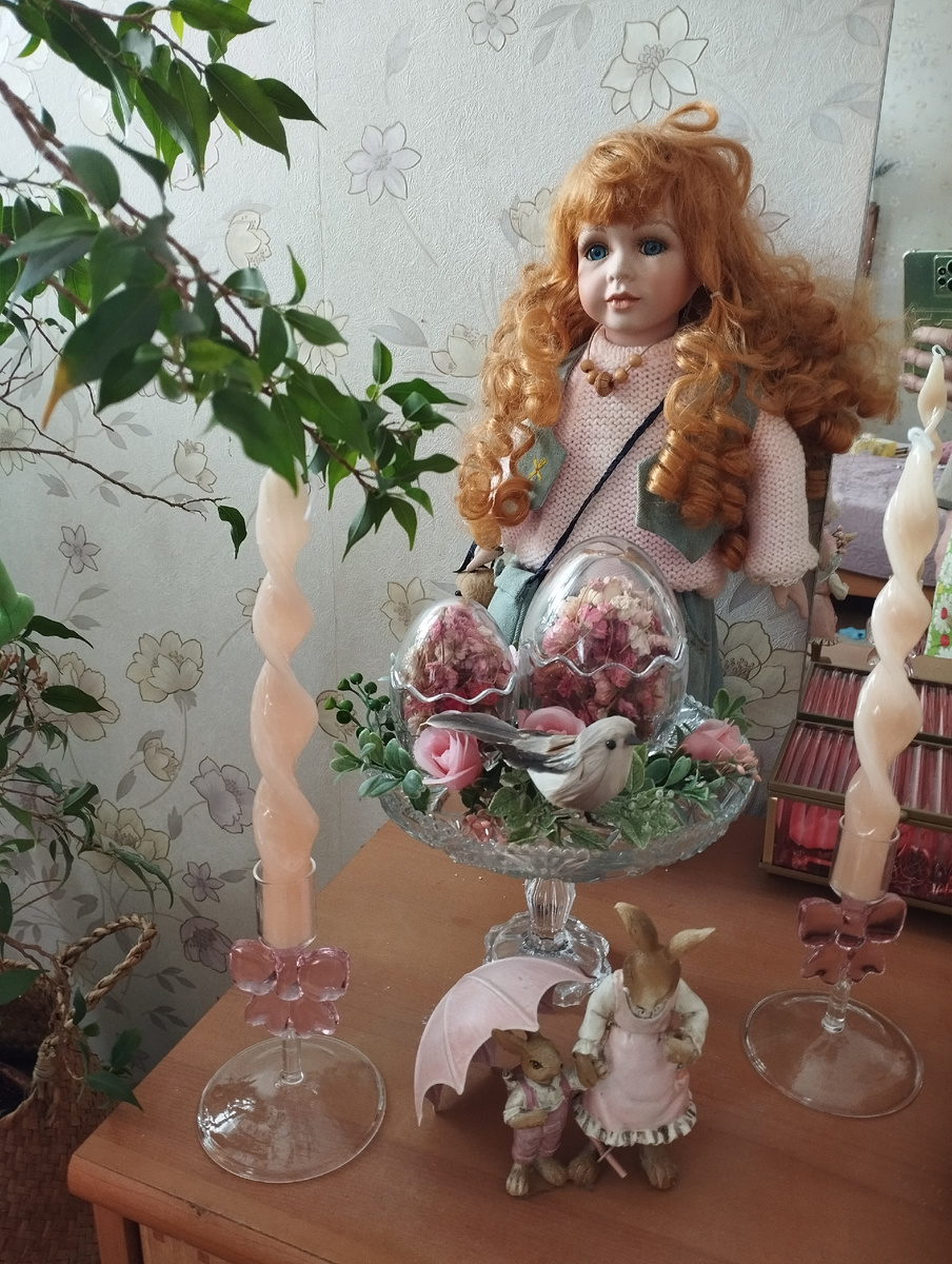 Совсем недавно в Женском клубе показывала свои первые в этом сезоне композиции. Была там стеклянная ваза но ножке, на которую я поставила такие же стеклянные яйца с наполнением. Ваза была сделана из предметов, купленных в Фиксе. На днях в Магнит-Косметик приобрела с хорошей скидкой пару стеклянных подсвечников с бантиками. По фактуре и цветовой гамме они отлично подошли к вазе. По поводу свечей ей сомнение. Попытаюсь найти что-то более розовое. Но пока так. Ещё одним дополнением стала фигурка кроликов. Обожаю такие штучки и собрала уже большую коллекцию. Ну а кукла - это постоянный декор в моем доме. На зиму только их меняю на зимние куклы.