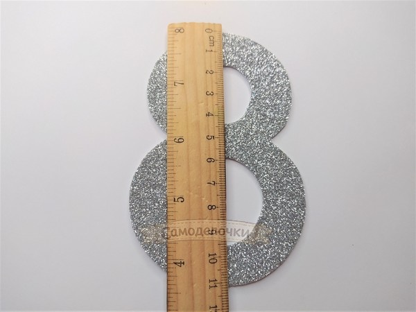 1. Для начала вы должны определится с размером восьмёрки, которую вы хотите. Я решила сделать не очень большую, около 11 см. Её в дальнейшем можно сделать магнитиком на холодильник или на шнурочке повесить на стенку. Если вы делаете украшение вместе с 6-7-летним ребёнком, то можно сделать её больше. Шаблон можно нарисовать самим или распечатать. Затем берём фоамиран, переворачиваем на обратную сторону и зубочисткой переводим шаблон. Вырезаем.