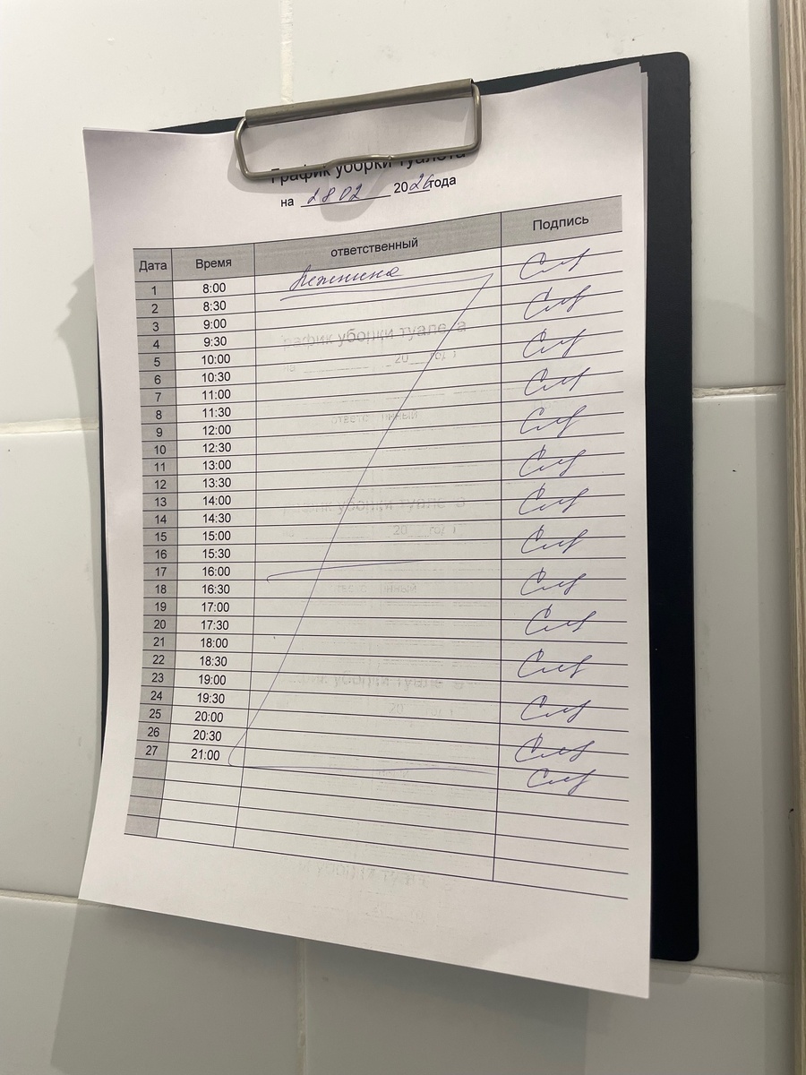 В одной из столовой города, сотрудник расписался наперед на весь день в графике уборки, которая должна проходить каждые 30 минут