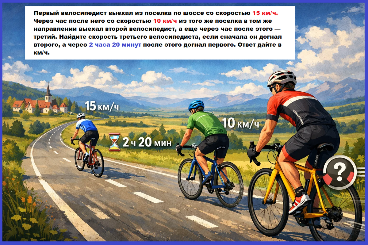 Первый велосипедист выехал из поселка по шоссе со скоростью 15 км/ч. Через час после него со скоростью 10 км/ч из того же поселка в том же направлении выехал второй велосипедист, а еще через час после этого — третий. Найдите скорость третьего велосипедиста, если сначала он догнал второго, а через 2 часа 20 минут после этого догнал первого. Ответ дайте в км/ч. Такие задачи удобно читать по частям: читаешь фразу → пытаешься написать математический эквивалент (формулу) по данной фразе. И так до конца. Самый важный отсчет времени начинается, когда в области видимости появляются все три велосипедиста. Тогда первые два уже куда-то уехали, а третий только начинает путь. Для третьего координата пропорциональна времени: x(t) = v * t. После составления уравнений остается только математика. И, как правило, в таких задачах появляется квадратное уравнение, которое пугает тем, что дает два корня для одной величины. Но один корень должен нарушать условие задачи или здравый смысл. Например, в наше