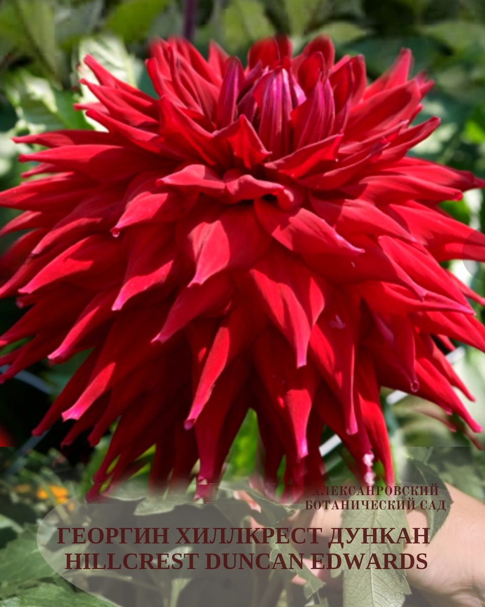 Размер цветка: диаметр 18-25см. Сорт зарегистрирован Jackson, Les (Great Britain), 2012г. Этот полу-кактусовый георгин выиграл несколько классов на выставке NDS 2012 на Великой осенней выставке в Харрогейте. Он также выиграл Мемориальный трофей Рона Нельсона за новый саженец гигантского или крупноцветкового сорта. Несмотря на красный цвет, он сохраняет свой цвет и не тускнеет.