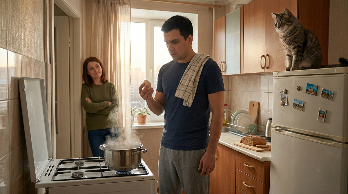 Я вышла. На плите стояла кастрюля. В кастрюле было что-то, напоминавшее белковый апокалипсис. Яйца он положил прямо в холодную воду. Потом поставил на максимальный огонь. Потом ушёл смотреть телефон.