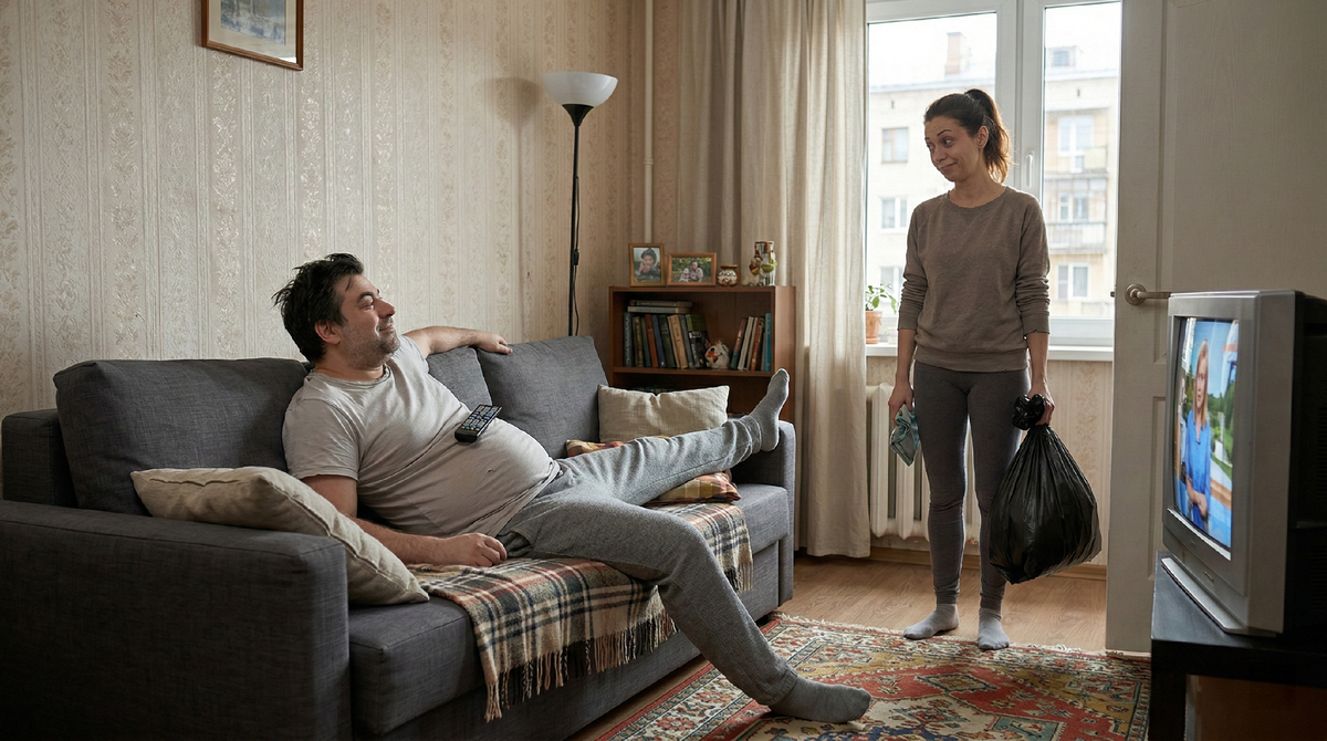 Я огляделась. Диван. Пульт. Передача о рыбной ловле. Вадик в позиции «горизонтальный философ» — одна нога на подлокотнике, вторая свисает, пульт на животе как орден за заслуги.