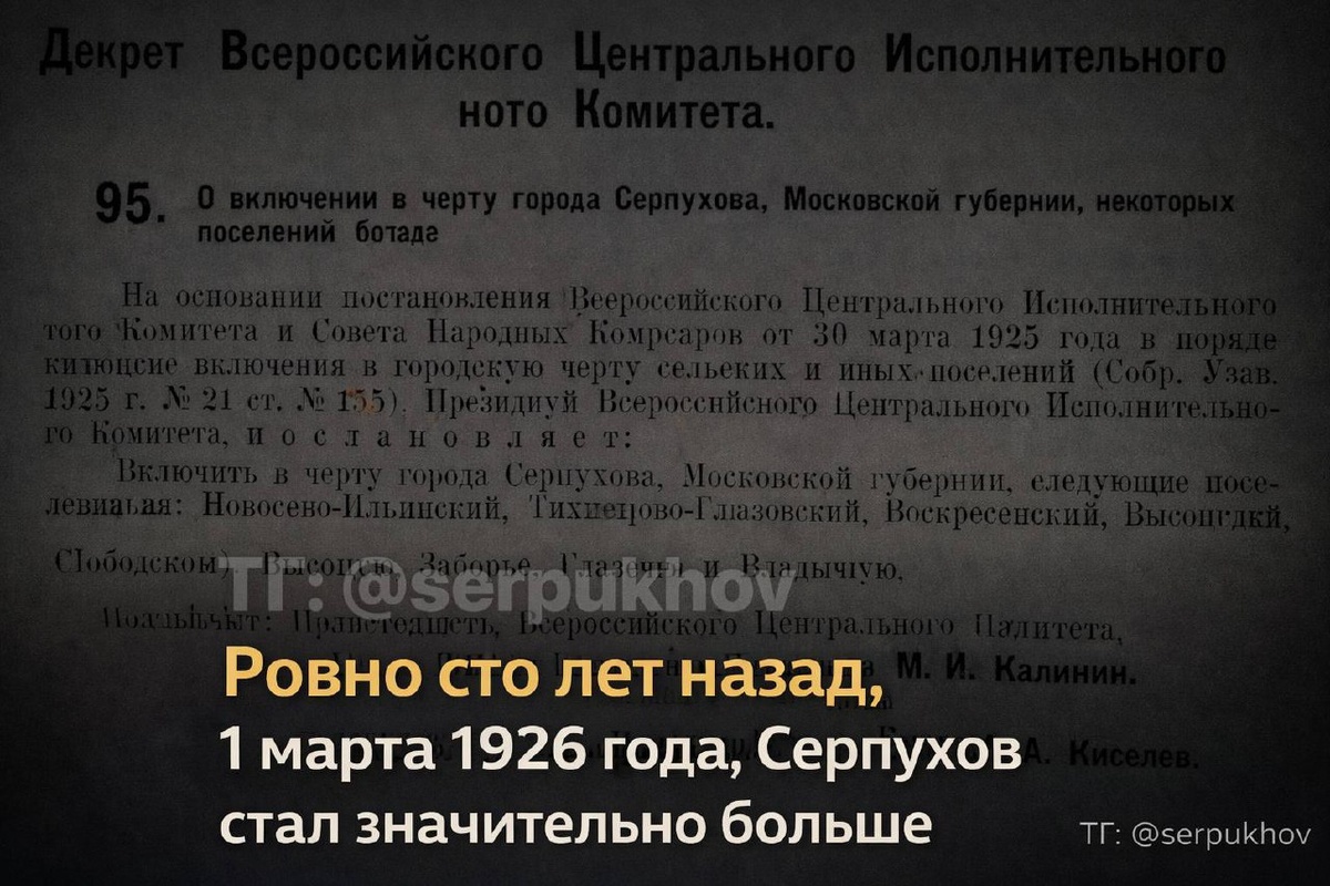 Именно в этот день председатель ВЦИК Михаил Калинин подписал декрет «О включении в черту города Серпухова, Московской губернии, некоторых поселений». Документом предписывалось сделать частью города сразу 11 пригородных посёлков. Названия некоторых из них уже стёрлись из памяти, но другие до сих пор живут в серпуховской топонимике. Так, частью Серпухова стали: ➡️ Богоявленско-Ильинский посёлок (нынешний район улиц Рабочей, Кожевенной, Макошина, Большой Профсоюзной, Калинина, Долгого переулка, 2-го Старого переулка и всех Поселковых переулков). ➡️ Тихвинско-Глазовский посёлок (сейчас это кварталы в районе улицы Пушкина и примыкающие к ней улицы и переулки — Сольца, Юннатов, Степанова и другие). ➡️ Глазечня — так ранее назывался посёлок, где сейчас расположены одноимённая улица, а также улицы Литвинова, Лавриненко, Казачкова, Ванюшина, Дачная, Крылова, 2-я Западная и другие. ➡️ Владычное, Высоцкое поселения и Заборье — здесь названия говорят сами за себя. ➡️ Свисталовка (Новосёлки)