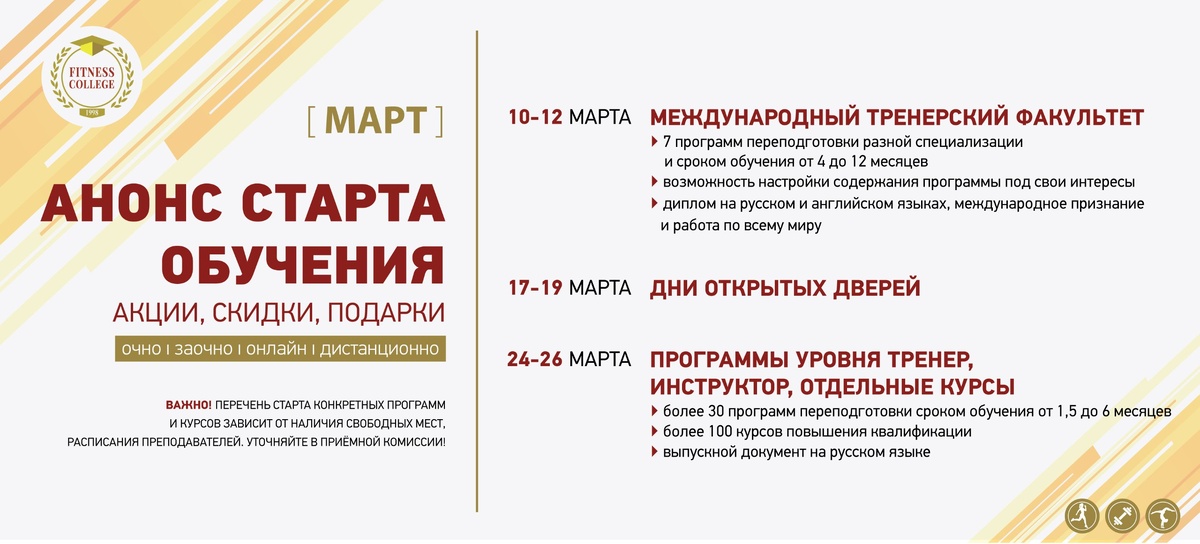 Весна — идеальный момент, чтобы вдохнуть новую жизнь в свою карьеру. Выбирайте удобный формат обучения: очно, заочно, онлайн или дистанционно. Места ограничены, успейте записаться! 🤍С 10 по 12 марта — МТФ Стартует набор на Международный тренерский факультет.7 программ профпереподготовки с разной специализацией. Срок обучения — от 4 до 12 месяцев. Гибкие настройки: вы можете корректировать содержание программы под свои интересы. По окончании — диплом на русском и английском языках с международным признанием, дающий право работать по всему миру. 🤍С 17 по 19 марта — ДНИ ОТКРЫТЫХ ДВЕРЕЙ Приглашаем на Дни открытых дверей онлайн. Это ваш шанс познакомиться с преподавателями, узнать все о программах и задать вопросы! 🤍 С 24 по 26 марта — СТАРТ ПРОГРАММ Погружение в профессию: стартуют программы уровня «Тренер», «Инструктор», а также отдельные курсы.Более 30 программ переподготовки (срок обучения от 1,5 до 6 месяцев) и свыше 100 курсов повышения квалификации. Выпускной документ — на русс