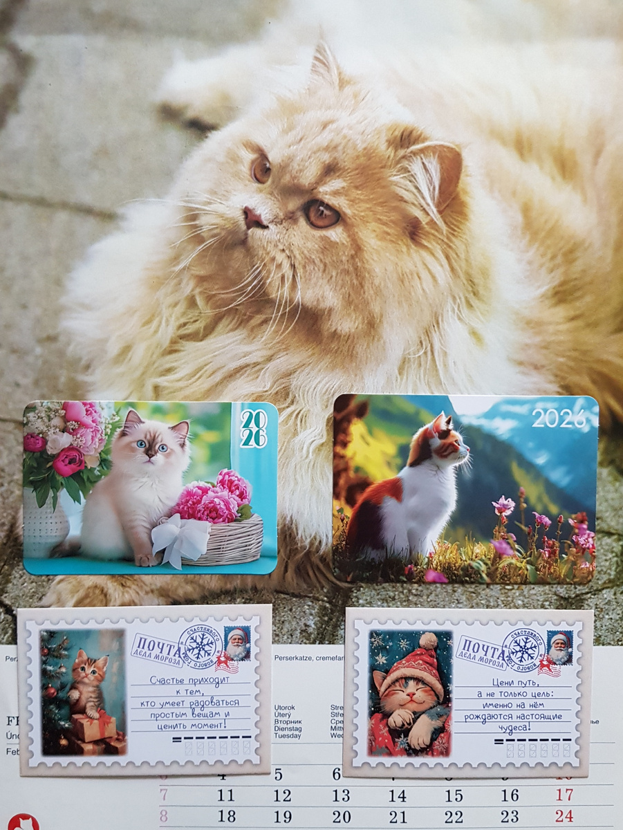 Первый день весны - первое марта!!! Ожидание чего-то светлого, теплого с надеждой на обретение равновесия. А кто может в этом помочь? Конечно же наши четвероногие любимцы. И первыми на очереди непревзойденные индикаторы психо-физического здоровья - коты, котики, кошаки, кошечки))) Не зря им поклонялись даже фараоны, создавая божества похожие на этих грациозных животных. Их воспевают поэты, запечатлевают в скульптурах, пишут картины художники и даже запускают новоселы первыми в жилище, чтобы жизнь в нем была благополучной. Многие известные личности считали своим долгом высказаться о роли кошки в мироздании. А я два года назад делала экспонат к юбилею Александра Лидерса, старейшины Московского клуба календаристов, по мотивам таких изречений. В ВК можно его увидеть здесь. А сегодня просто покажу карманные календарики с мурлыками, которые еще не представляла вашему вниманию. В течении многих веков человек и кошка соседствуют на нашей планете и да будет так еще много веков вперед. Пожелаю