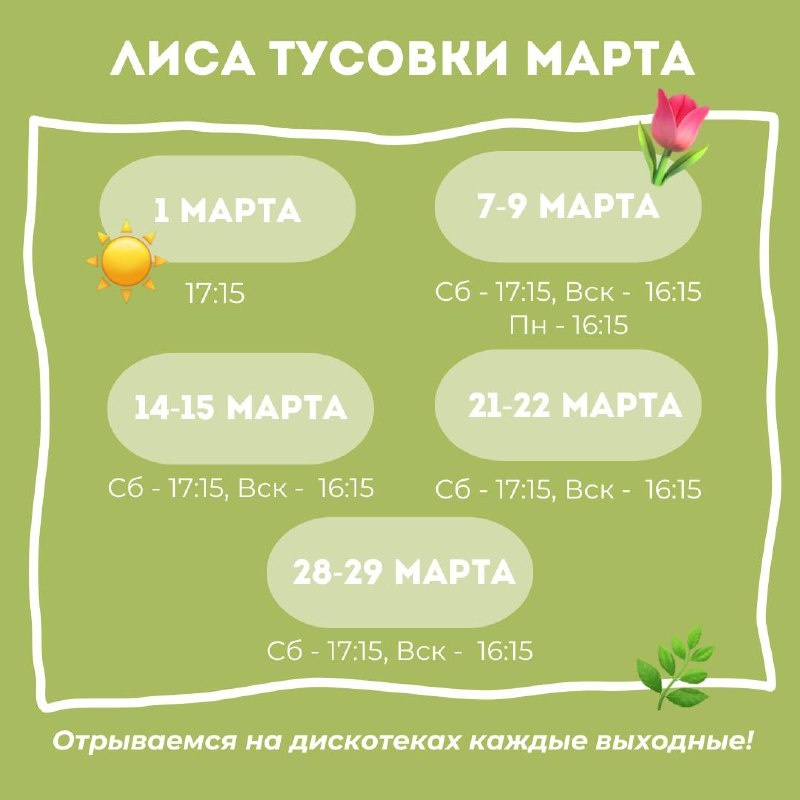 ! 🌿✨ Мы открываем новый сезон весенних чудес, встречайте расписание любимых семейных дискотек, которые проходят в Рыжей Долине каждые выходные Впереди нас ждёт так много прекрасных праздничных событий! Большие выходные в честь 8 марта, Международный день театра кукол и Всемирный день театра. Совсем скоро обо всём вам расскажем🧡