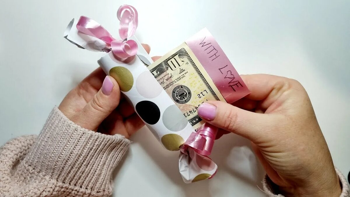 Подарить деньги бывает проще, чем выбрать подарок. Да и что говорить, этому универсальному дару обрадуется любой. А если вы хотите, чтобы ваш подарок не только порадовал, но и удивил, развеселил, оформите ваш материальный презент необычным способом. Соберите нужную сумму для дарения. Из каждой бумажной купюры сверните трубочку и аккуратно склейте ее малюсеньким кусочком скотча. Лучше использовать малярный скотч, он не так сильно прилипает к купюрам, ведь очень важно не повредить бумагу. Затем сложите из трубочек любую фигуру (может быть, к празднику что-то особенно актуально): машину, человечка, зайчика и т.д. Если фигурка будет большая, то можно разменять купюры номиналом поменьше, чтобы хватило «строительного» материала. Склейте из простого белого картона волшебную палочку. Раскрасьте ее или обклейте цветной бумагой, а внутрь, свернув в трубочку, положите деньги. Волшебная палочка будет служить по прямому назначению – исполнит желания! Купите или испеките сами вкусный торт. Также при